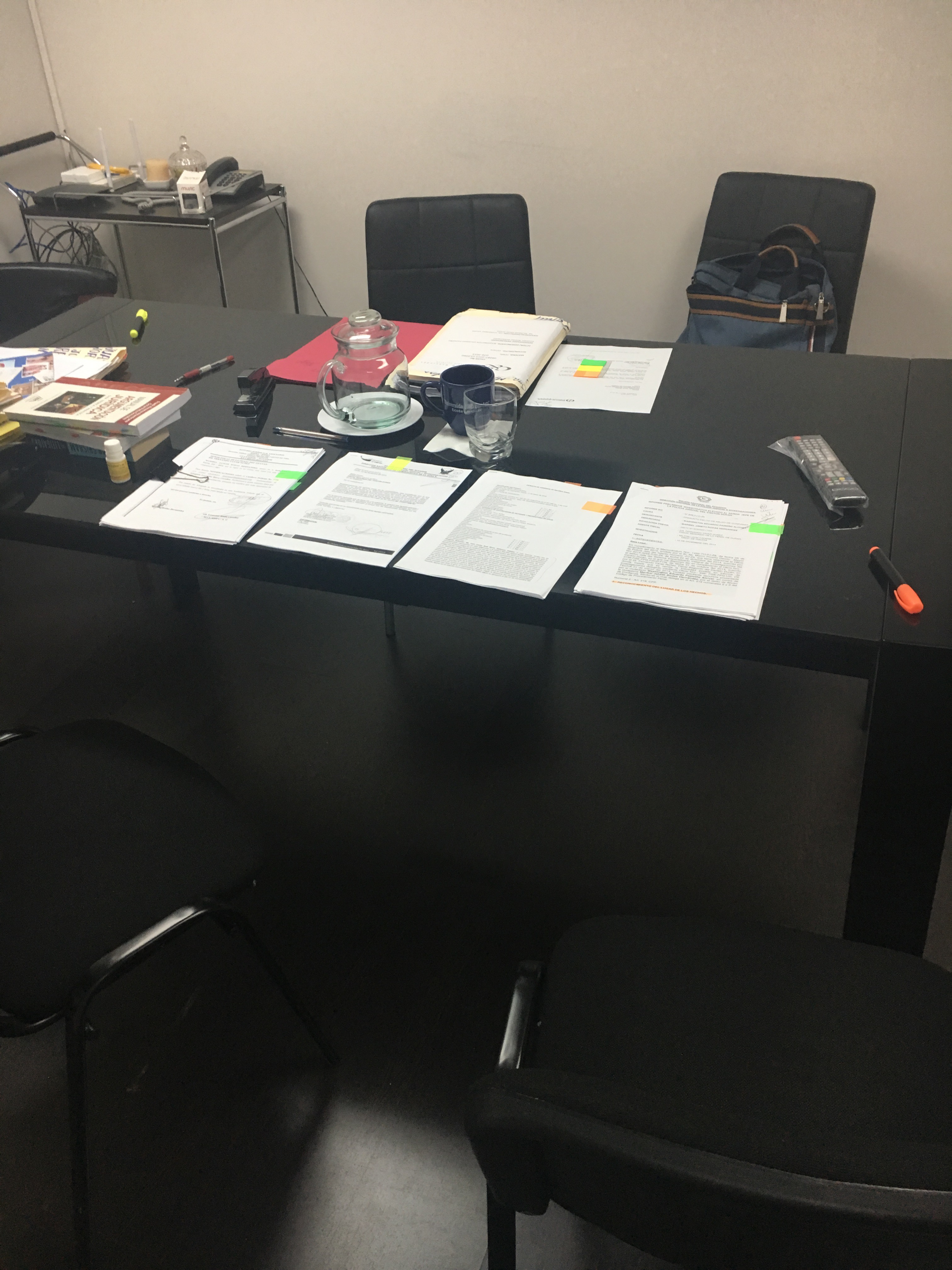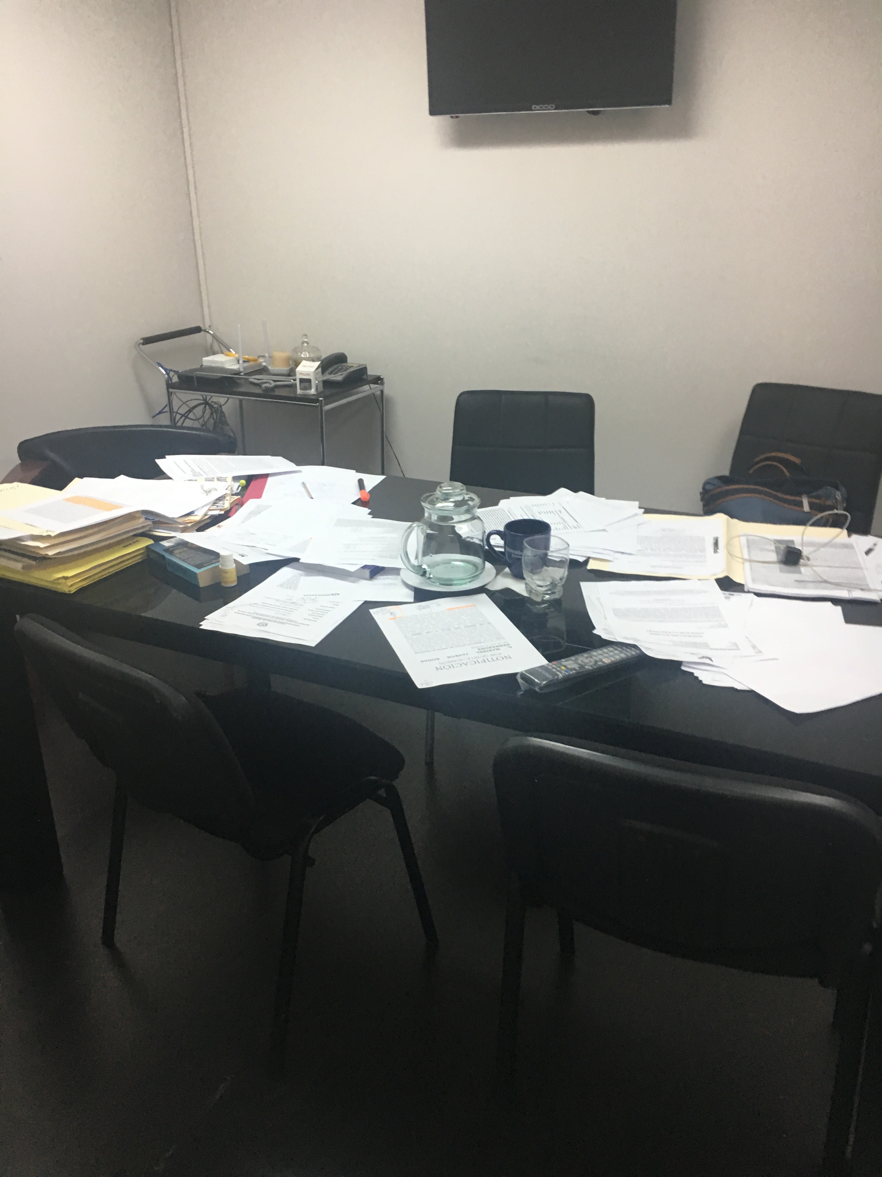 Comparto estas dos imágenes de lo que llamo «el cuarto de guerra», que es un nombre ambicioso para la sala de mi firma que se usa (entre otras cosas) para estudiar casos previo a alguna diligencia ante la sala.