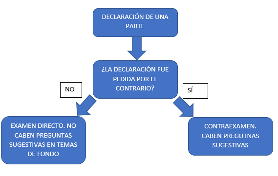 • Entonces, hay que aplicar la norma recorriendo de atrás hacia adelante, ya que primero hay que determinar quién pidió la declaración de la parte que está testificando. Verificado esto, se allanará el camino sobre la procedencia o no de las tantas veces mencionadas preguntas sugestivas.